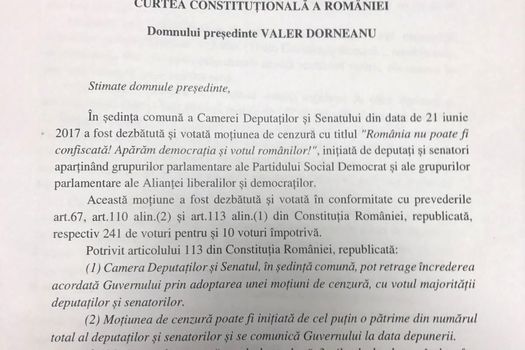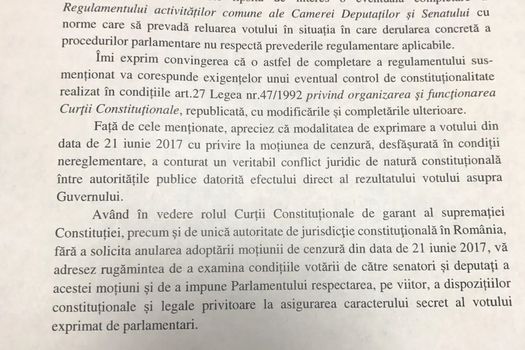 ”Apreciez că modalitatea de exprimare a votului din 21 iunie 2017 cu privire la moţiunea de cenzură, desfăşurată în condiţii neregulamentare, a conturat un veritabil conflict juridic de natură constituţională între auorităţile publice datorită efectului direct al rezultatului votului asupra Guvernului”, se mai arată în sesizare.