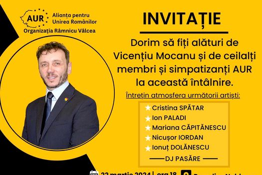 Omul de afaceri Vicenţiu Mocanu, soţul cântăreţei Cristina Spătar, îşi va lansa vineri, 22 martie, candidatura la funcţia de primar în Râmnicu Vâlcea din partea Alianţei pentru Unirea Românilor (AUR).