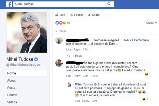Răspunsul lui Mihai Tudose nu a întârziat să apară: „Şi cum ar trebui să dovedesc că sunt eu cel care postează…? Apropo de gluma cu micii, ar trebui să pun tot o poză cu Dragnea în maşină? O zi frumoasă, la mulţi ani!”.