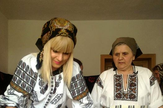 Udrea apare în fotografii alături de mai multe femei îmbrăcate în costum popular. La rândul său, ea este îmbrăcată cu ie, blugi, pe cap are batic şi este încălţată cu pantofi roşii cu toc cui.