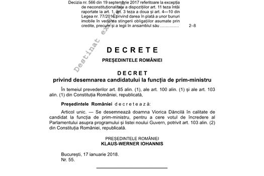 În decretul publicat miercuri în Monitorul Oficial se arată că „se desemnează doamna Viorica Dăncilă în calitate de candidat la funcţia de prim-ministru pentru a cere votul de încredere al Parlamentului asupra programuljui şi listei noului guvern potrivit art 103 (alin.2) din Constituţia României, republicată”.