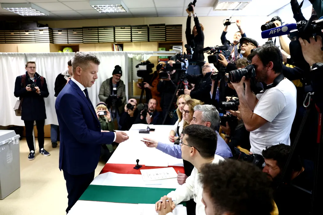 BUDAPEST, HUNGARY - APRIL 12: Tisza Party candidate, Peter Magyar votes for the general election at a polling station in Budapest, Hungary on April 12, 2026. Jakub Porzycki / Anadolu/ABACAPRESS.COM