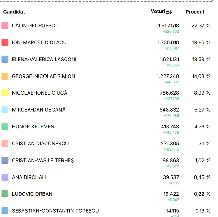 Alegeri prezidenţiale 2024, turul I. Numărătoarea voturilor s-a încheiat. Diferenţă de 2.742 de voturi între Elena Lasconi şi Marcel Ciolacu / Călin Georgescu pe primul loc cu 22,94%