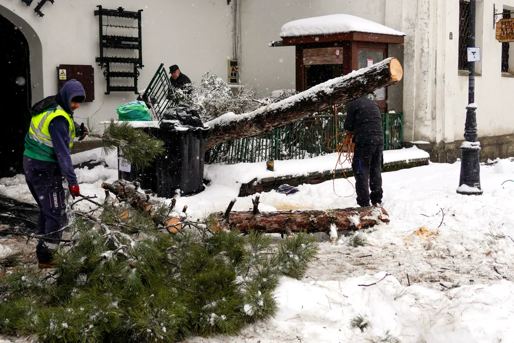 Personal din grupa operativa a ISUBIF indeparteaza un copac cazut, in Bucuresti, miercuri, 18 februarie 2026. Un Cod portocaliu de viscol puternic este in vigoare in judetele de sud-est, iar Bucurestiul si Ilfovul sunt sub Cod portocaliu de ninsoare abundenta. Prognoza meteo ANM anunta vreme rece si conditii severe pana joi dimineata. RAUL STEF/ MEDIAFAX FOTO