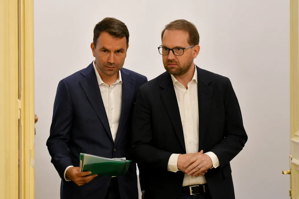 Presedintele USR, Dominic Fritz (D), impreuna cu Catalin Drula (S), candidatul USR pentru Primaria Capitalei, la depunerea dosarului de candidatura la alegerile pentru Primaria Capitalei la Biroul Electoral al Circumscriptiei municipiului Bucuresti, miercuri, 12 noiembrie 2025. ALEXANDRU DOBRE / MEDIAFAX FOTO