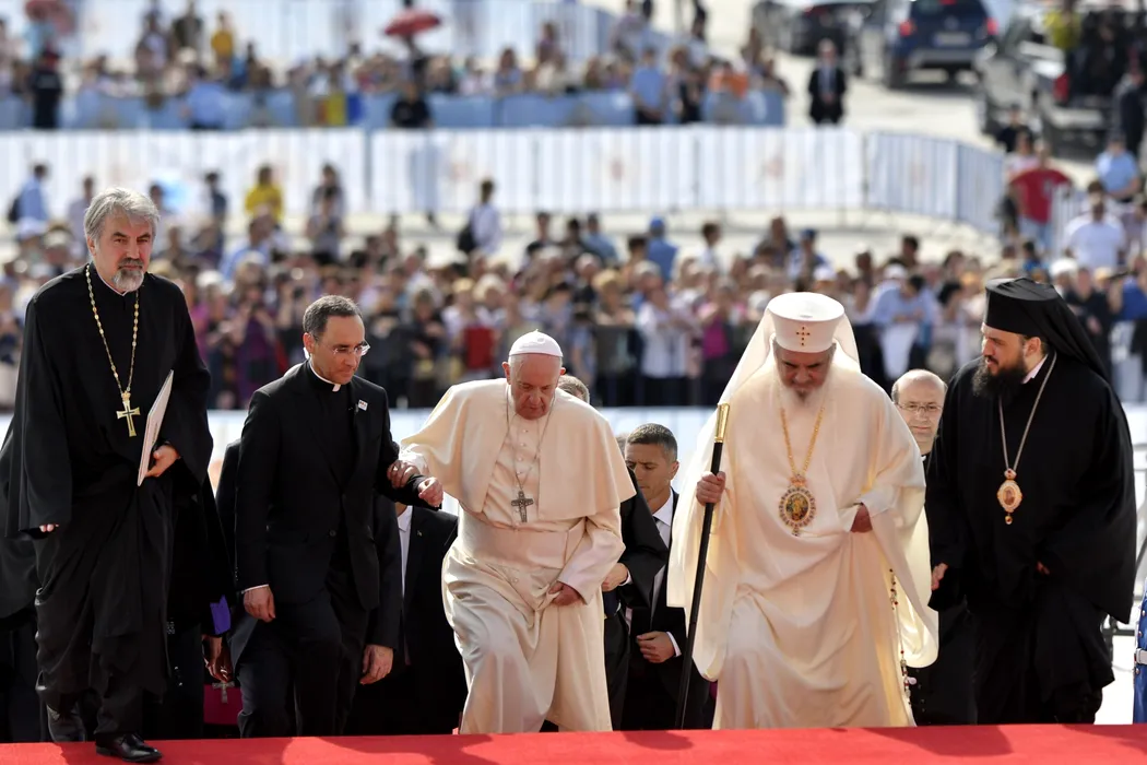 Papa Francisc (C) si Patriarhul Daniel sosesc impreuna la Catedrala Neamului din Bucuresti, vineri 31 mai 2019. ANDREEA ALEXANDRU / MEDIAFAX FOTO