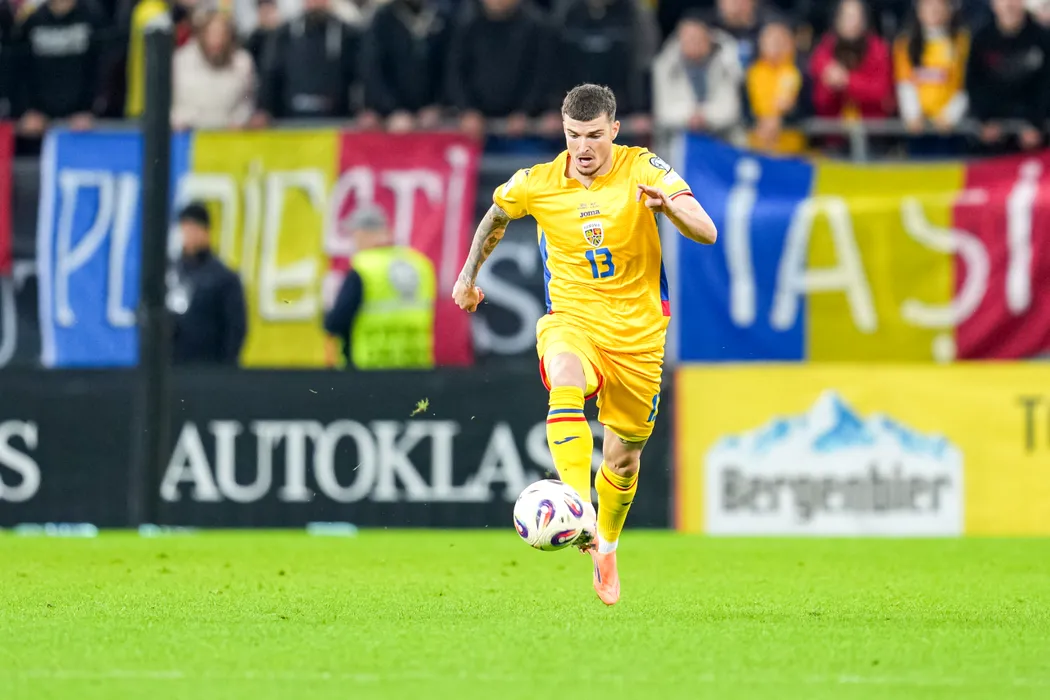 Valentin Mihaila, de la echipa nationala a Romaniei, suteaza in timpul meciului de fotbal contra selectionatei Austriei din preliminariile Campionatului Mondial 2026, disputat pe Arena Nationala din Bucuresti, duminica, 12 octombrie 2025. MARC MARASESCU / MEDIAFAX FOTO