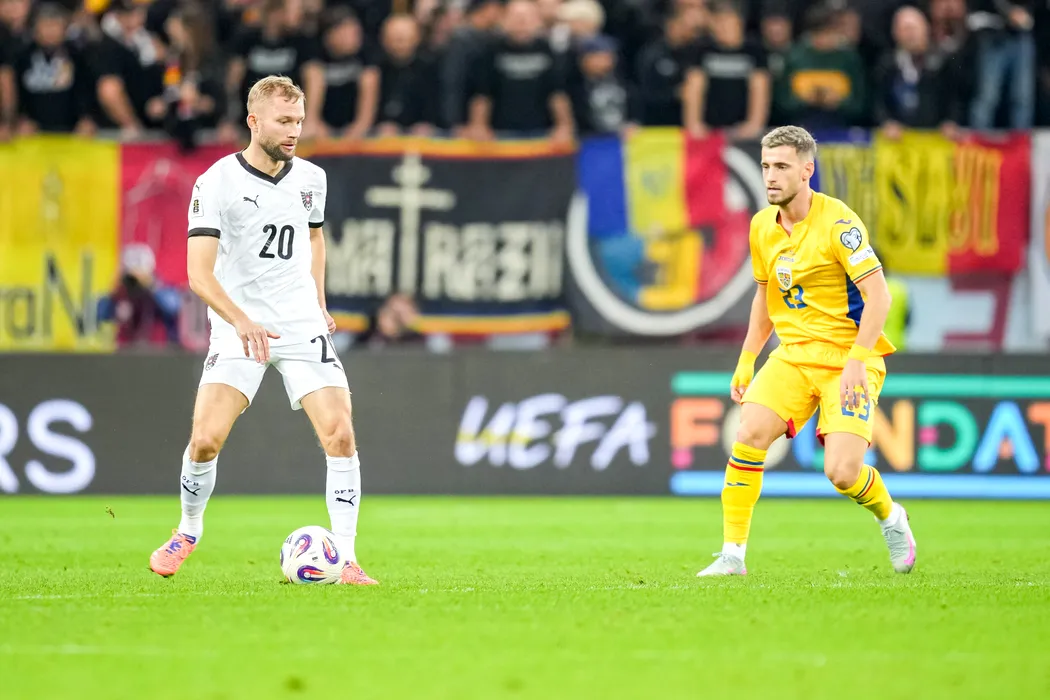 Konrad Laimer (S), de la nationala de fotbal a Austriei, lupta pentru balon cu Vlad Dragomir (D), de la selectionata Romaniei, in meciul din preliminariile Cupei Mondiale din 2026, disputat pe Arena Nationala din Bucuresti, duminica, 12 octombrie 2025. MARC MARASESCU / MEDIAFAX FOTO