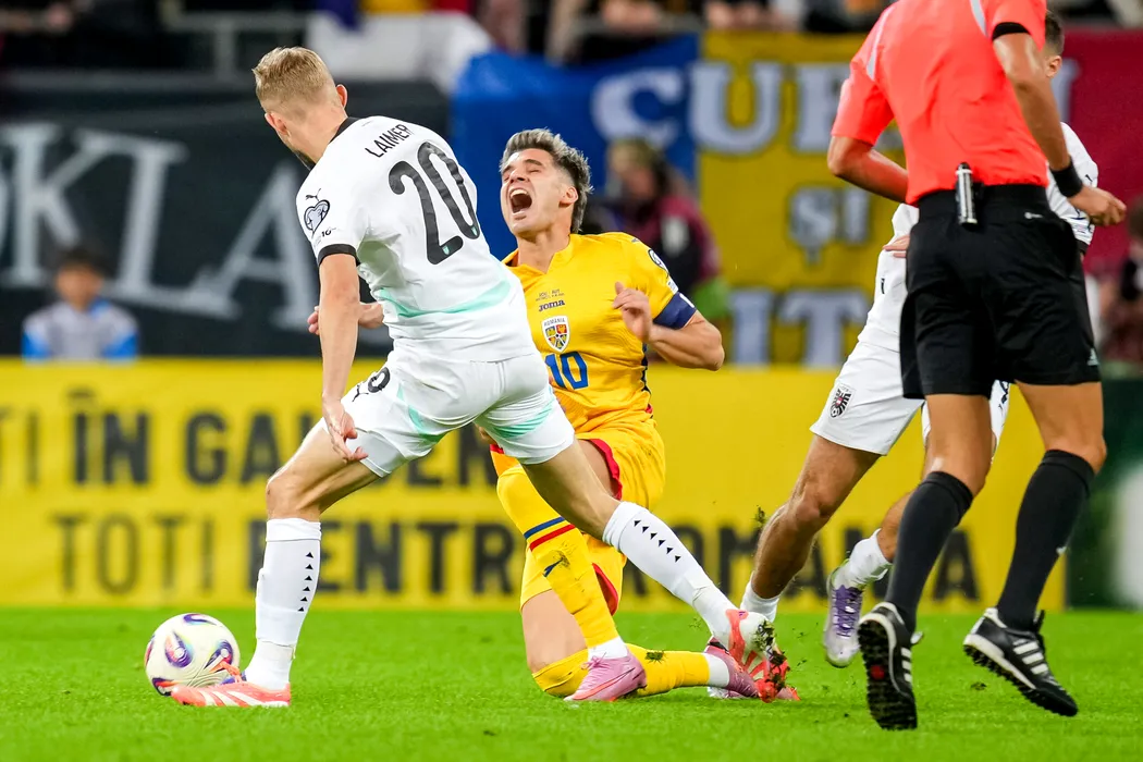 Konrad Laimer (S), de la nationala de fotbala a Austriei, lupta pentru balon cu Ianis Hagi (D), de la selectionata Romaniei, in meciul din preliminariile Cupei Mondiale din 2026, disputat pe Arena Nationala din Bucuresti, duminica, 12 octombrie 2025. MARC MARASESCU / MEDIAFAX FOTO