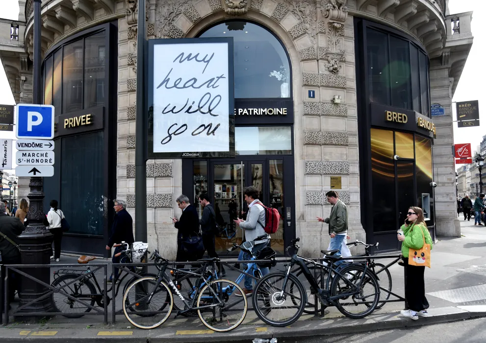 Celine Dion's song titles are displayed in the streets of Paris, "Pour que tu m'aimes encore, Encore un soir, My Heart Will Go On, S'il suffisait d'aimer, Power of Love" France on March 24, 2026. Photo by Alain Apaydin/ABACAPRESS.COM Date de PDV ; 24/03/2026