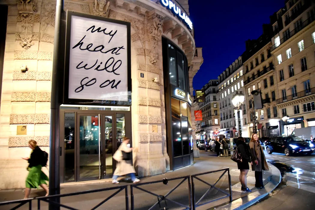 Celine Dion's song titles are displayed in the streets of Paris, "Pour que tu m'aimes encore, Encore un soir, My Heart Will Go On, S'il suffisait d'aimer, Power of Love" France on March 24, 2026. Photo by Alain Apaydin/ABACAPRESS.COM Date de PDV ; 24/03/2026