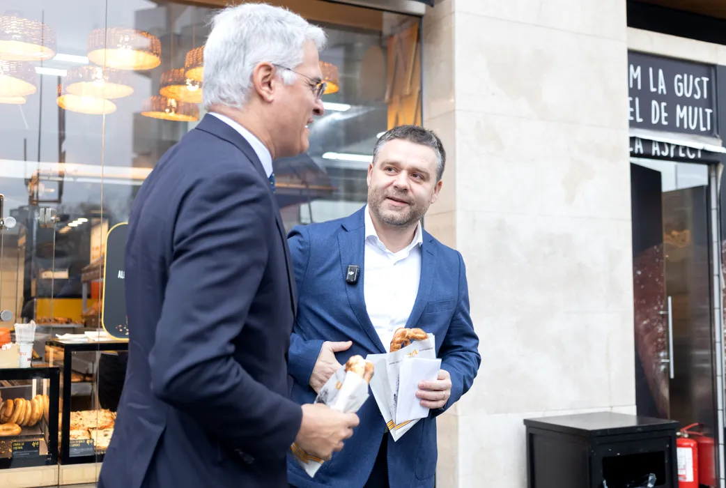 Ciprian Ciucu, candidatul PNL la alegerile din 7 decembrie pentru Primaria Capitalei, discuta cu Dragos Pislaru, ministrul Investitiilor si Proiectelor Europene, la coada de la o covrigarie, dupa ce primarul sectorului 6 si-a depus dosarul de candidatura la Biroul Electoral Municipal, joi, 13 noiembrie 2025. ALEXANDRA PANDREA / GMN / MEDIAFAX FOTO