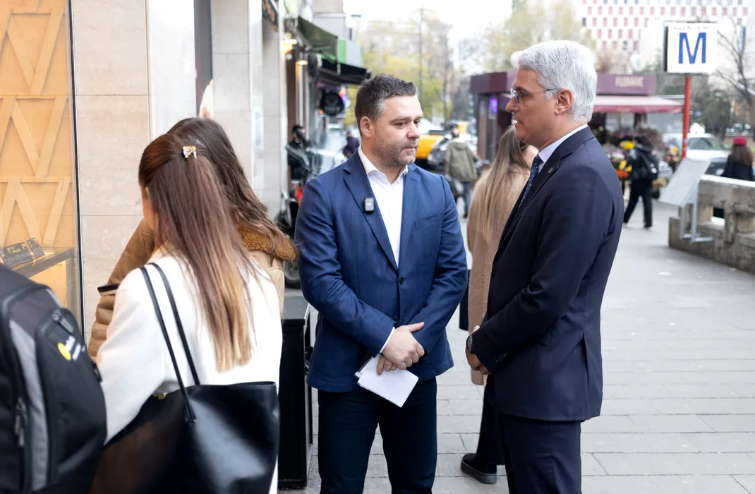Ciprian Ciucu, candidatul PNL la alegerile din 7 decembrie pentru Primaria Capitalei, discuta cu Dragos Pislaru, ministrul Investitiilor si Proiectelor Europene, la coada de la o covrigarie, dupa ce primarul sectorului 6 si-a depus dosarul de candidatura la Biroul Electoral Municipal, joi, 13 noiembrie 2025. ALEXANDRA PANDREA / GMN / MEDIAFAX FOTO