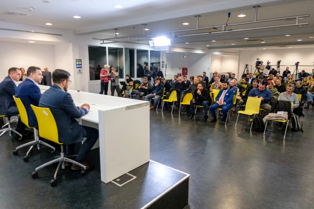 Persoane participa la dezbaterea privind administrarea Arenei Nationale, organizata de primarul general al Capitalei, Ciprian Ciucu, in Bucuresti, vineri, 3 aprilie 2026. ALEXANDRU NECHEZ / MEDIAFAX FOTO