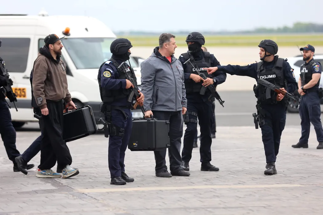 Coiful de aur de la Cotofenesti si o bratara dacica multispirala sunt descarcate sub escorta speciala pe Aeroportul International „Henri Coanda”, dupa ce au fost repatriate din Olanda, marti, 21 aprilie 2026. Piesele de tezaur au fost transportate in conditii de maxima siguranta pentru a fi redate patrimoniului national. MIHAI POP / GMN / MEDIAFAX FOTO