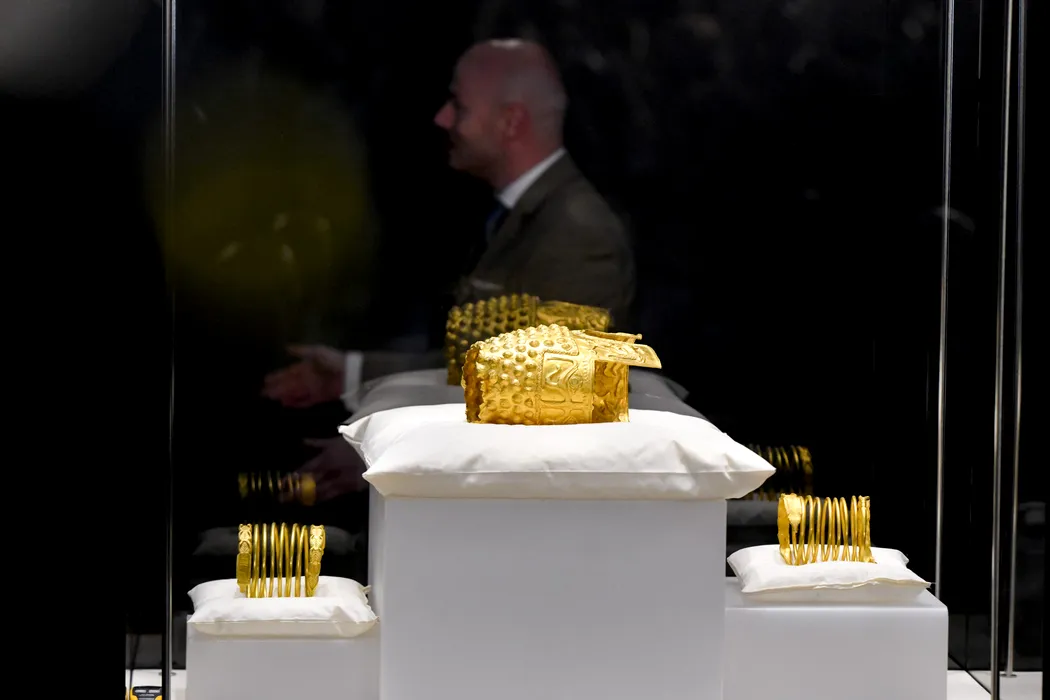 Coiful de aur de la Cotofenesti si bratarile dacice multispirala sunt expuse publicului la Muzeul National de Istorie a Romaniei (MNIR), imediat dupa finalizarea procedurilor de receptie in urma repatrierii din Olanda, marti, 21 aprilie 2026. ALEXANDRU DOBRE / MEDIAFAX FOTO