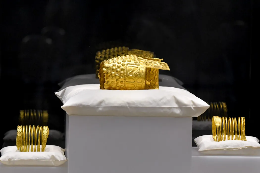 Coiful de aur de la Cotofenesti si bratarile dacice multispirala sunt expuse publicului la Muzeul National de Istorie a Romaniei (MNIR), imediat dupa finalizarea procedurilor de receptie in urma repatrierii din Olanda, marti, 21 aprilie 2026. ALEXANDRU DOBRE / MEDIAFAX FOTO