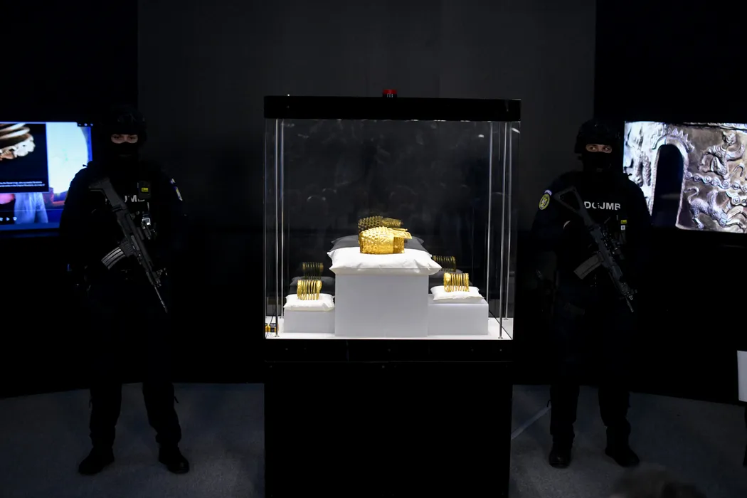 Coiful de aur de la Cotofenesti si bratarile dacice multispirala sunt expuse publicului la Muzeul National de Istorie a Romaniei (MNIR), imediat dupa finalizarea procedurilor de receptie in urma repatrierii din Olanda, marti, 21 aprilie 2026. ALEXANDRU DOBRE / MEDIAFAX FOTO