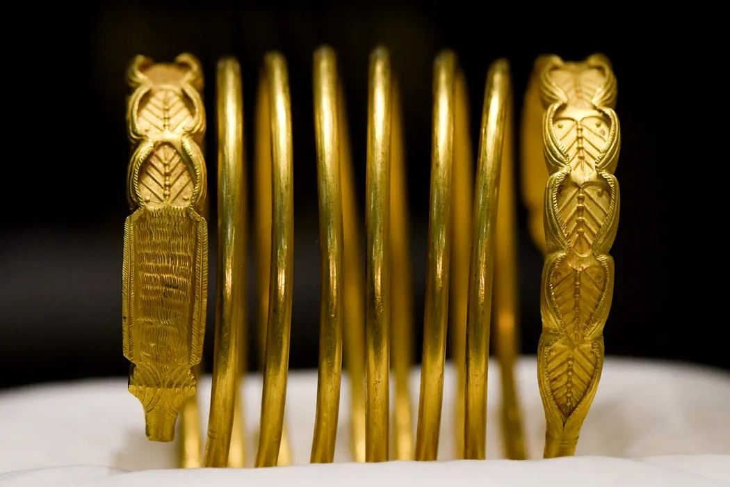 Coiful de aur de la Cotofenesti si bratarile dacice multispirala sunt expuse publicului la Muzeul National de Istorie a Romaniei (MNIR), imediat dupa finalizarea procedurilor de receptie in urma repatrierii din Olanda, marti, 21 aprilie 2026. ALEXANDRU DOBRE / MEDIAFAX FOTO