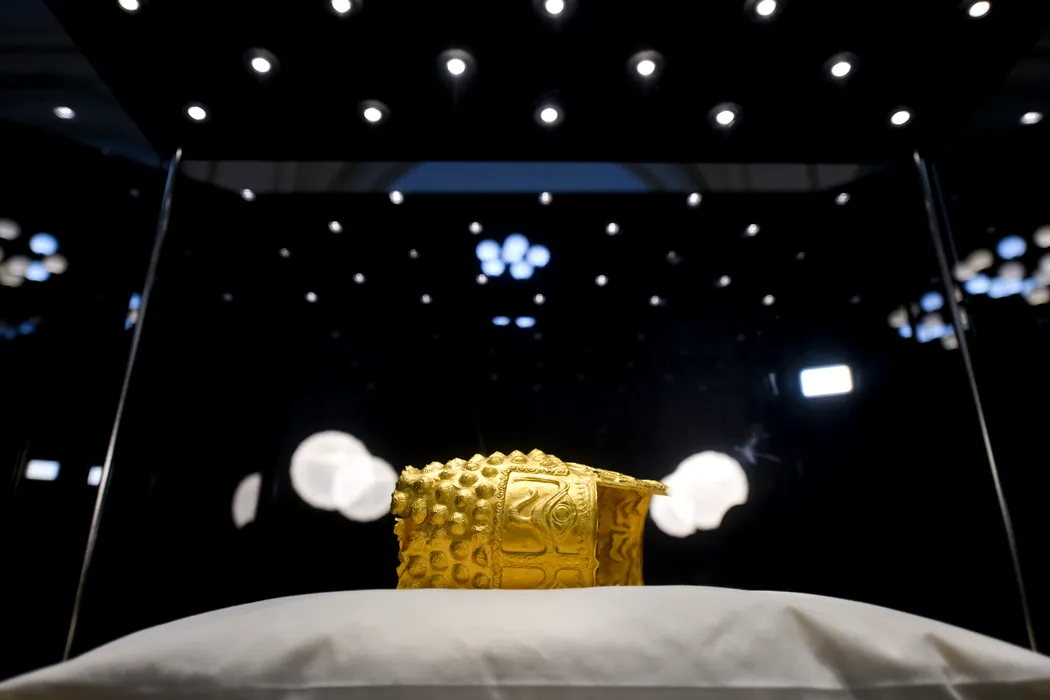 Coiful de aur de la Cotofenesti si bratarile dacice multispirala sunt expuse publicului la Muzeul National de Istorie a Romaniei (MNIR), imediat dupa finalizarea procedurilor de receptie in urma repatrierii din Olanda, marti, 21 aprilie 2026. ALEXANDRU DOBRE / MEDIAFAX FOTO