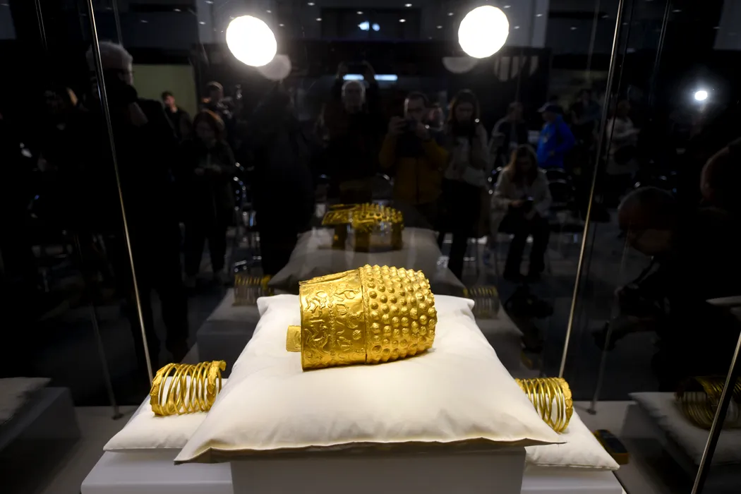 Coiful de aur de la Cotofenesti si bratarile dacice multispirala sunt expuse publicului la Muzeul National de Istorie a Romaniei (MNIR), imediat dupa finalizarea procedurilor de receptie in urma repatrierii din Olanda, marti, 21 aprilie 2026. ALEXANDRU DOBRE / MEDIAFAX FOTO