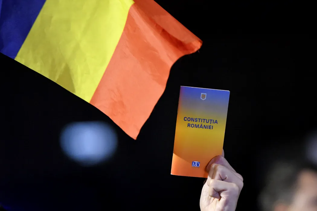 Un barbat tine in mana Constitutia Romaniei in timpul unui protest al sustinatorilor candidatului independent la alegerile prezidentiale 2025, Calin Georgescu, desfasurat in fata sediului CCR din Bucuresti, marti, 11 martie 2025. ALEXANDRU DOBRE / MEDIAFAX FOTO