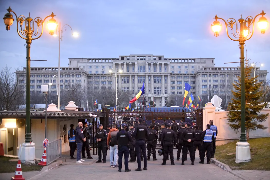 Forte de ordine prezente in timpul unui protest al sustinatorilor candidatului independent la alegerile prezidentiale 2025, Calin Georgescu, desfasurat in fata sediului CCR din Bucuresti, marti, 11 martie 2025. Calin Georgescu nu va putea candida la alegerile prezidentiale din luna mai, au decis marti seara judecatorii Curtii Constitutionale a Romaniei, care au respins – in unanimitate – toate contestatiile impotriva deciziei Biroului Electoral Central prin care i-a fost respinsa candidatura la alegerile prezidentiale. ALEXANDRU DOBRE / MEDIAFAX FOTO