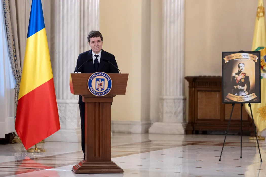 Presedintele Nicusor Dan sustine o alocutiune in cadrul ceremoniei organizata cu ocazia repatrierii ramasitelor pamantesti ale lui Grigore Alexandru Ghyka (1807-1857), ultimul Domn al Moldovei, in Sala Unirii a Palatului Cotroceni, duminica, 9 noiembrie 2025. ALEXANDRA PANDREA / GMN / MEDIAFAX FOTO