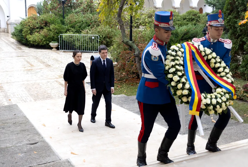 Presedintele Nicusor Dan si Mihaela Gradinaru sosesc la Palatul Cotroceni pentru a participa la ceremonia organizata cu ocazia repatrierii ramasitelor pamantesti ale lui Grigore Alexandru Ghyka, ultimul Domn al Moldovei, duminica, 9 noiembrie 2025. ALEXANDRA PANDREA / GMN / MEDIAFAX FOTO