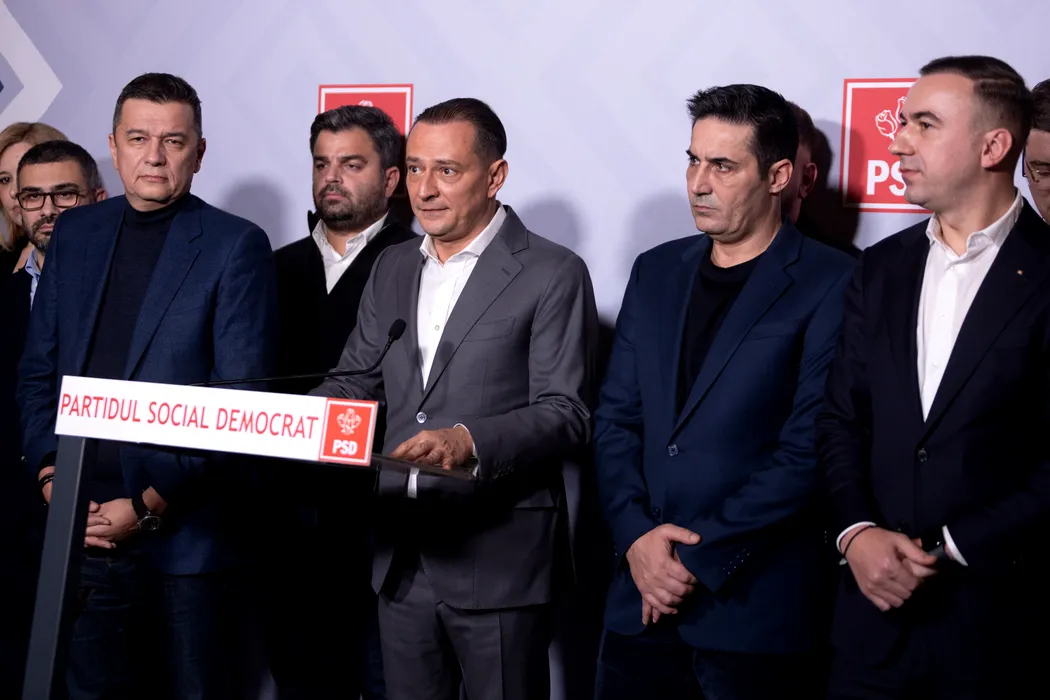 Candidatul PSD la Primaria Capitalei, Daniel Baluta (C), sustine un discurs dupa aflarea rezultatelor exit-poll pentru alegerile locale partiale 2025, la sediul partidului din Bucuresti, duminica, 7 noiembrie 2025. ALEXANDRA PANDREA / GMN / MEDIAFAX FOTO