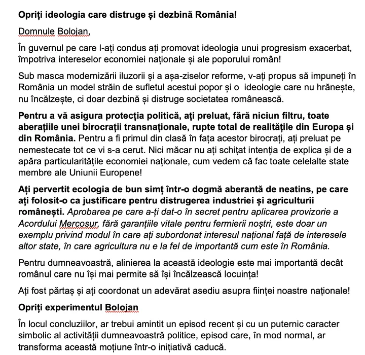 DOCUMENT. UPDATE. Moțiunea de cenzură PSD – AUR acuză Guvernul Bolojan că nu mai guvernează în interesul României. 254 de semnături au fost depuse pentru demiterea actualului Executiv