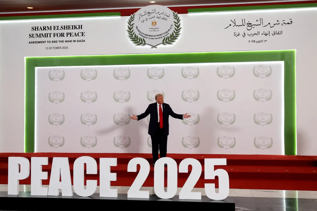 13 October 2025, Egypt, Sharm El-Sheikh: US President Donald Trump gestures as he poses for a photo at the Sharm El-Sheikh Peace Summit in Egypt. The meeting of heads of state and government is to discuss support for the Gaza Strip following the ceasefire between Israel and Hamas. Photo: Suzanne Plunkett/PA Wire/dpa
