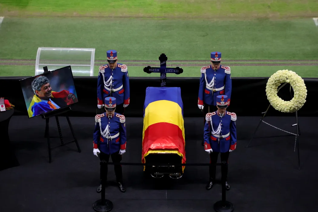 Sicriul cu trupul neinsufletit al fostului antrenor al echipei nationale de fotbal, Mircea Lucescu, a fost depus la Arena Nationala din Bucuresti, miercuri, 8 aprilie 2026. Mircea Lucescu a incetat din viata marti seara, la varsta de 80 de ani, la Spitalul Universitar de Urgenta din Bucuresti, unde fusese internat dupa ce i s-a facut rau in timpul unui antrenament al selectionatei Romaniei. MIHAI POP / GMN / MEDIAFAX FOTO