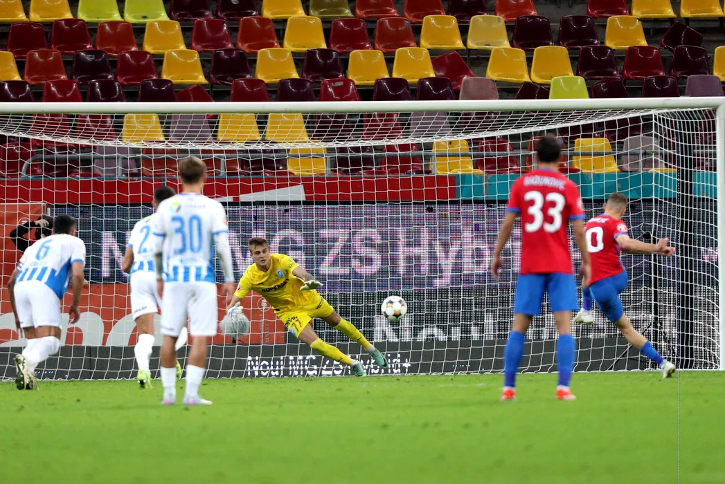 Florin Tanase (D), de la FCSB, inscrie un gol in timpul meciului de fotbal contra echipei Universitatea Craiova din etapa a XII-a a Superligii, disputat pe Arena Nationala din Bucuresti, duminica, 5 octombrie 2025. MIHAI POP / GMN / MEDIAFAX FOTO