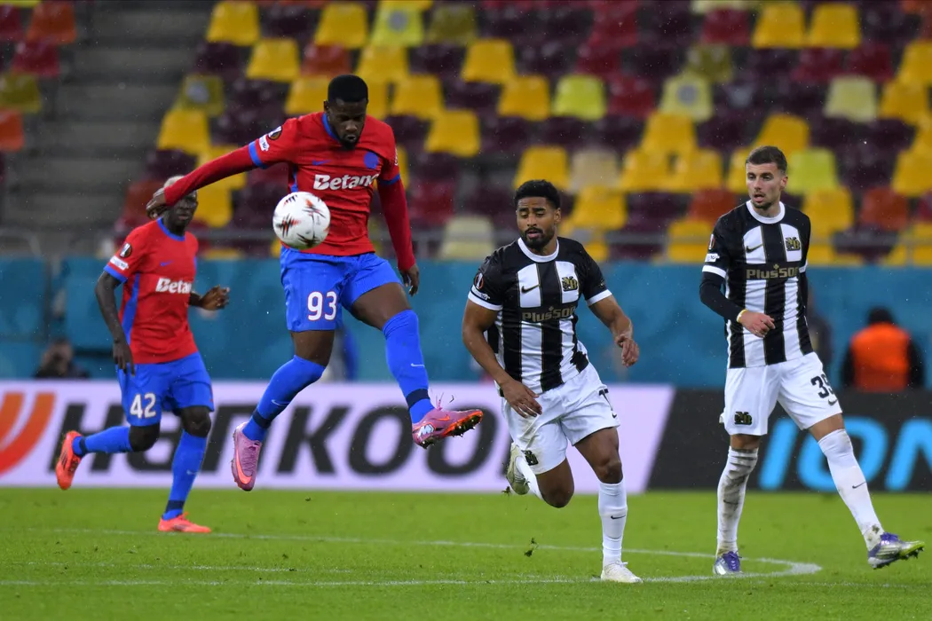Mamadou Thiam (S), de la echipa FCSB, suteaza in timpul meciului contra echipei BSC Young Boys din runda a doua a fazei principale din Europa League, joi, 2 octombrie 2025, pe stadionul National Arena din Bucuresti. ALEXANDRU DOBRE / MEDIAFAX FOTO