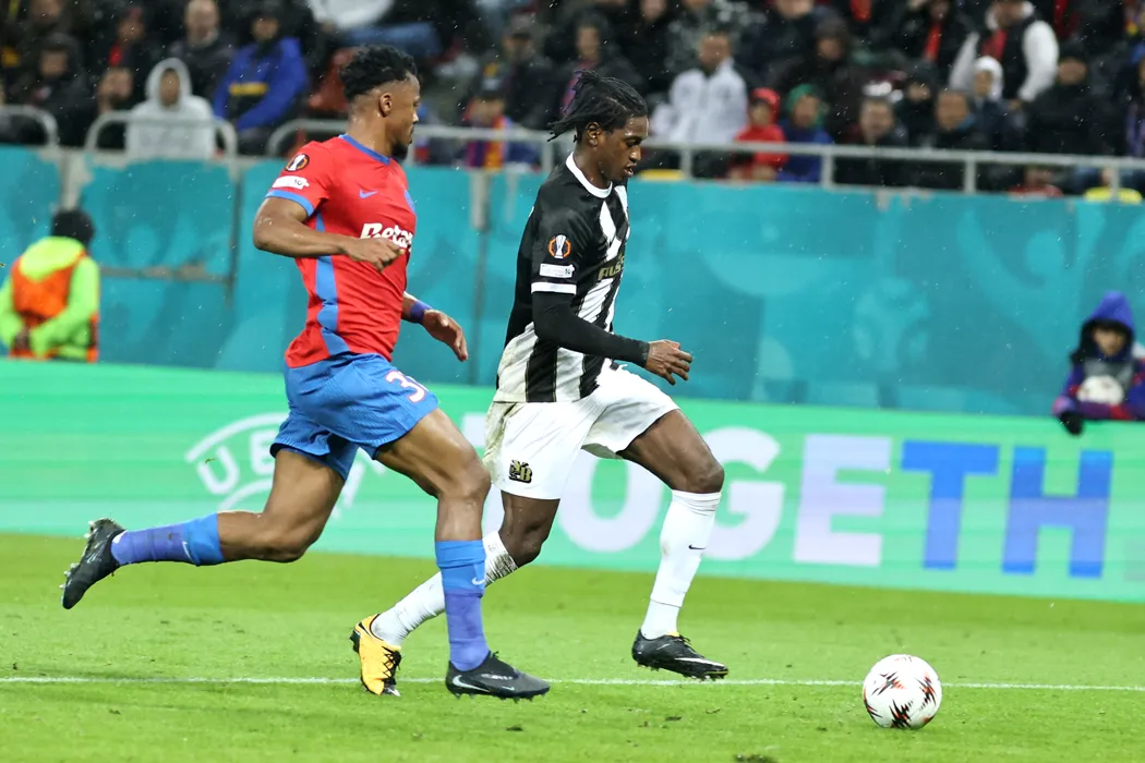 Siyabonga Ngezana (S), de la echipa FCSB, lupta pentru balon cu Joel Monteiro (D), de la echipa BSC Young Boys, in meciul din runda a doua a fazei principale din Europa League, joi, 2 octombrie 2025, pe stadionul National Arena din Bucuresti. GEORGE FLUSTER / MEDIAFAX FOTO