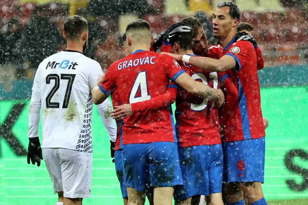 Jucatorii formatiei FCSB reactioneaza dupa ce au inscris un gol in timpul meciului de fotbal contra echipei Csikszereda, din etapa a XXIV-a a Superligii, disputat pe Arena Nationala din Bucuresti, duminica, 1 februarie 2026. GEORGE FLUSTER / MEDIAFAX FOTO