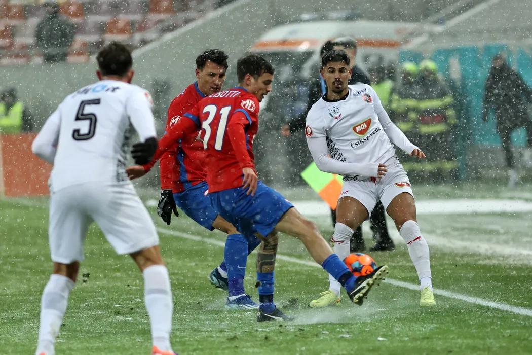 Yuri Cisotti (C), de la FCSB, suteaza in timpul meciului de fotbal contra echipei Csikszereda, din etapa a XXIV-a a Superligii, disputat pe Arena Nationala din Bucuresti, duminica, 1 februarie 2026. GEORGE FLUSTER / MEDIAFAX FOTO