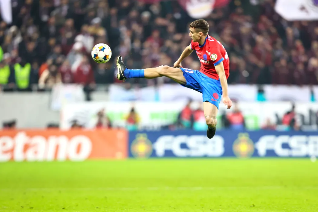 Yuri Cisotti, de la FCSB, suteaza in timpul meciului de fotbal contra echipei Rapid din etapa a XXI-a a Superligii, disputat pe Arena Nationala din Bucuresti, duminica, 20 decembrie 2025. MIHAI POP / GMN / MEDIAFAX FOTO