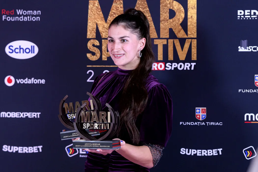 Ancuta Bodnar, medaliata cu argint la Campionatul Mondial de la Shanghai 2025, este premiata la Gala Mari Sportivi 2025, eveniment anual organizat de ProSport, desfasurat la Bucuresti, miercuri, 27 noiembrie 2025. Foto: Alexandru Dobre / Mediafax Foto.