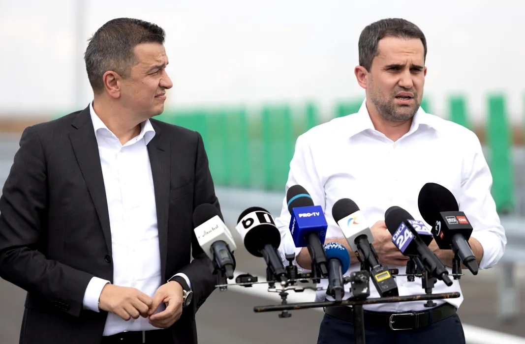 Ministrul Transporturilor si Infrastructurii, Ciprian Serban (D), si presedintele interimar al PSD, Sorin Grindeanu (S), sustin declaratii de presa inaintea inaugurarii lotului 3 al autostrazii A0 Sud Bragadiru – Joita, luni, 30 iunie 2025. ALEXANDRA PANDREA/GMN/MEDIAFAXFOTO