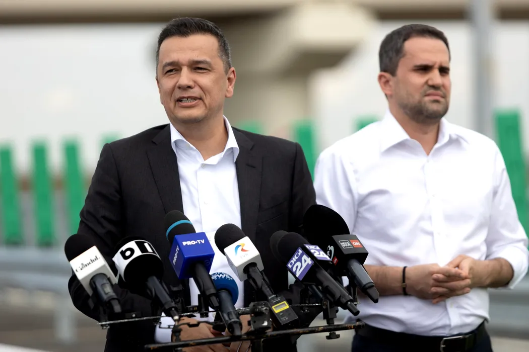 Ministrul Transporturilor si Infrastructurii, Ciprian Serban (D), si presedintele interimar al PSD, Sorin Grindeanu (S), sustin declaratii de presa inaintea inaugurarii lotului 3 al autostrazii A0 Sud Bragadiru – Joita, luni, 30 iunie 2025. ALEXANDRA PANDREA/GMN/MEDIAFAXFOTO