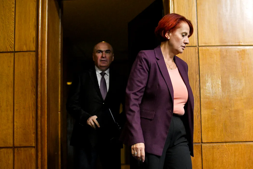 Ioana Dogioiu (D), purtator de cuvant al Guvernului Romaniei, si premierul Ilie Bolojan (S) sosesc in sala de conferinte, la Palatul Victoria din Bucuresti, miercuri, 24 septembrie 2025. ALEXANDRU DOBRE / MEDIAFAX FOTO