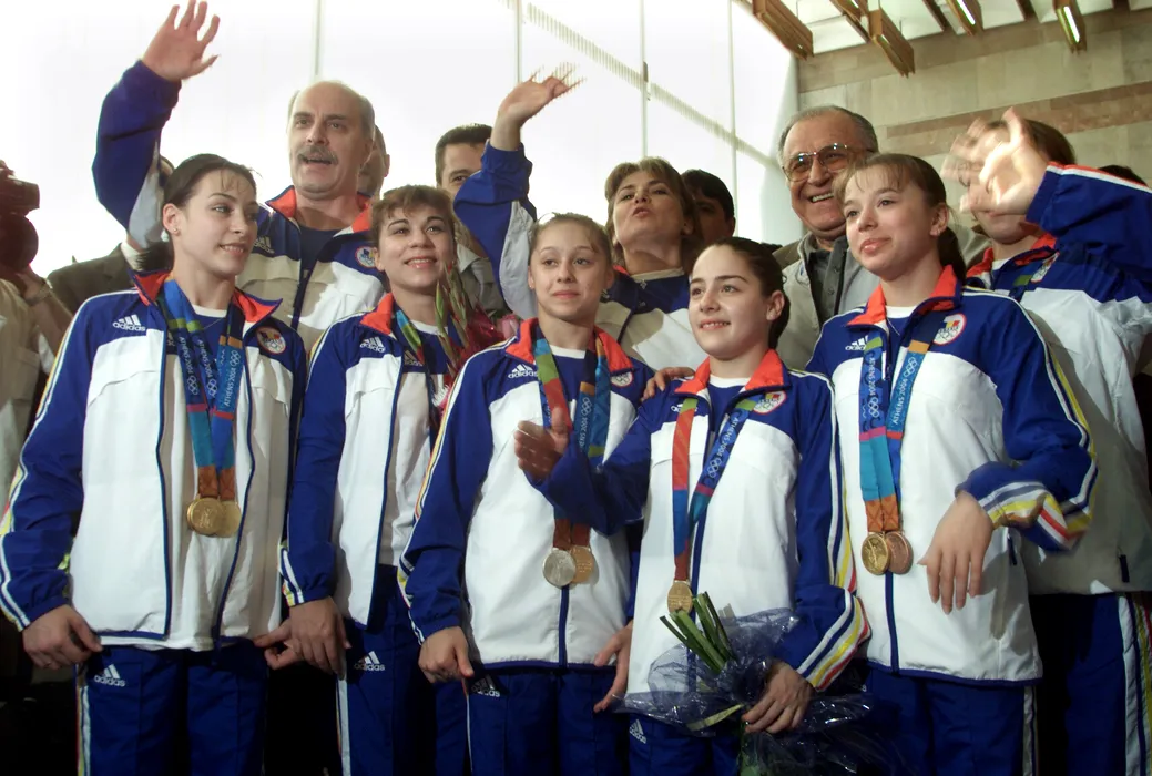Loturile de gimnastica feminina si masculina au fost intimpinate si felicitate, miercuri, la sosirea in tara de la Jocurile Olimpice, de presedintele Romaniei Ion Iliescu in salonul oficial al Aeroportului "Henri Coanda". In imagine, Catalina Ponor, Octavian Belu, Silvia Stroescu, Dana Sofronie, Maria Bitang, Oana Ban, Ion Iliescu si Alexandra Eremia