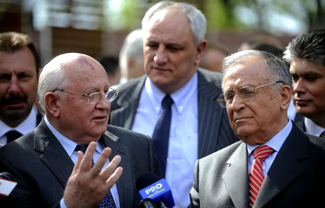 Fostul presedinte sovietic, Mihail Gorbaciov (S), si fostul presedinte al Romaniei, Ion Iliescu (D), fac o declaratie de presa, dupa un dineu, in Bucuresti, miercuri, 14 aprilie 2010. RAZVAN CHIRITA / MEDIAFAX FOTO