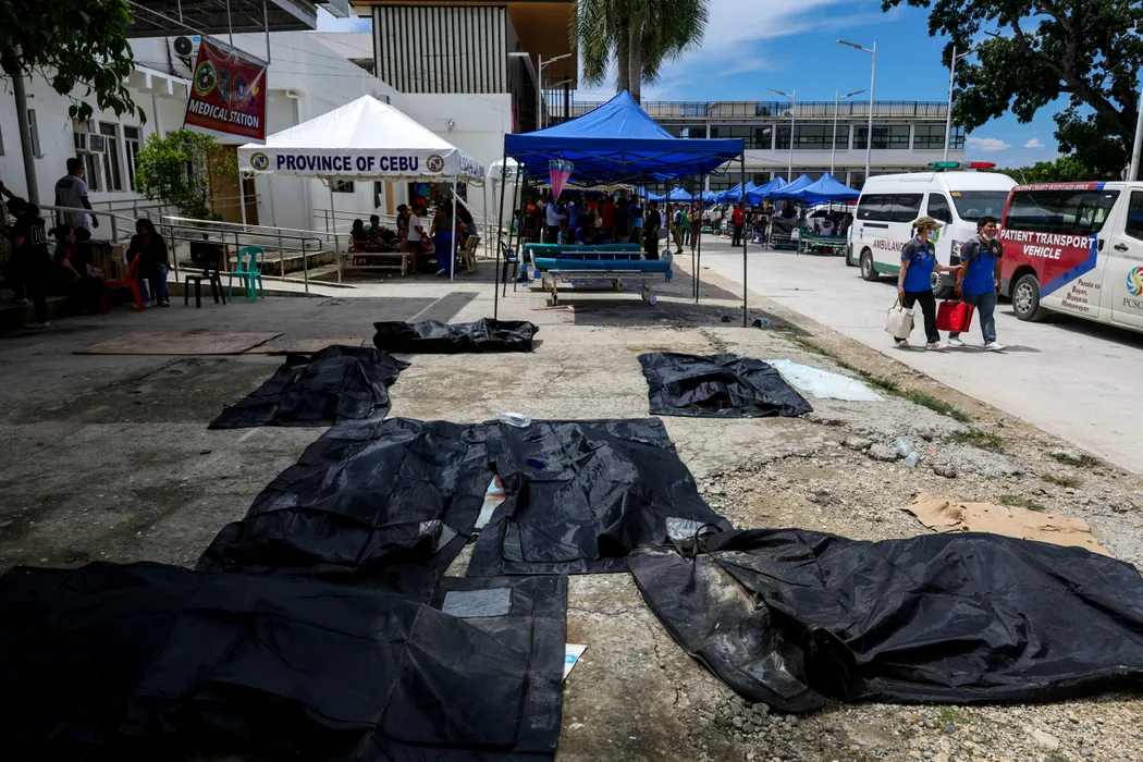 BOGO CITY, CEBU, PHILIPPINES - OCTOBER 1: Bodies of local residents who died in earthquake are placed outside a hospital before being transferred, following a magnitude 6.9 earthquake that jolted parts of the island, in Bogo City, Cebu, Philippines on October 01, 2025. Widespread damages to structures and properties, and multiple injuries and deaths have been reported following a powerful magnitude 6.9 earthquake that struck parts of Cebu on September 30. Local governments have declared a state of calamity in response to the situation, amid continued aftershocks. Daniel Ceng / Anadolu/ABACAPRESS.COM