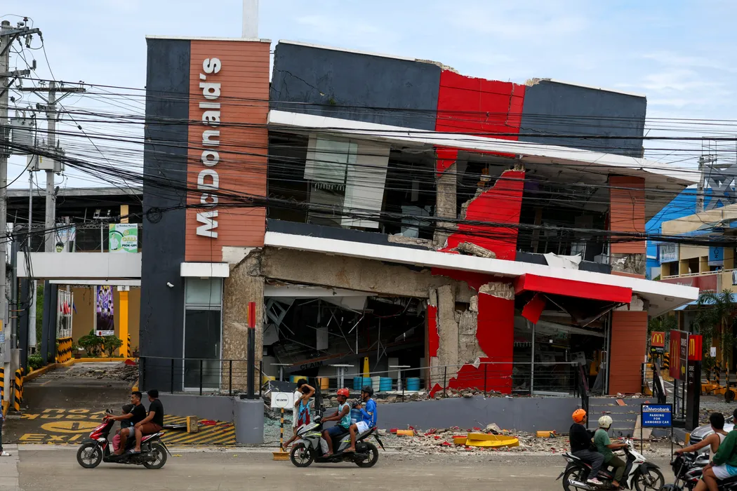 BOGO CITY, CEBU, PHILIPPINES - OCTOBER 1: An international American fast-good restaurant is partially collapsed, following a magnitude 6.9 earthquake that jolted parts of the island, in Bogo City, Cebu, Philippines on October 01, 2025. Widespread damages to structures and properties, and multiple injuries and deaths have been reported following a powerful magnitude 6.9 earthquake that struck parts of Cebu on September 30. Local governments have declared a state of calamity in response to the situation, amid continued aftershocks. Daniel Ceng / Anadolu/ABACAPRESS.COM