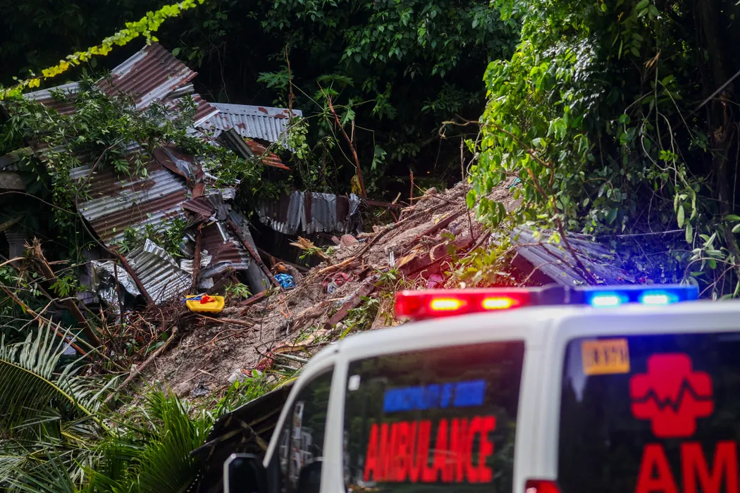CEBU, PHILIPPINES - OCTOBER 1: A landslide caused by earthquake crushed a house where a man is believed to have been trapped, following a magnitude 6.9 earthquake that jolted parts of the island, in Cebu, Philippines on October 01, 2025. Widespread damages to structures and properties, and multiple injuries and deaths have been reported following a powerful magnitude 6.9 earthquake that struck parts of Cebu on September 30. Local governments have declared a state of calamity in response to the situation, amid continued aftershocks. Daniel Ceng / Anadolu/ABACAPRESS.COM