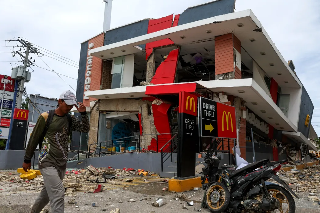 BOGO CITY, CEBU, PHILIPPINES - OCTOBER 1: An international American fast-good restaurant is partially collapsed, following a magnitude 6.9 earthquake that jolted parts of the island, in Bogo City, Cebu, Philippines on October 01, 2025. Widespread damages to structures and properties, and multiple injuries and deaths have been reported following a powerful magnitude 6.9 earthquake that struck parts of Cebu on September 30. Local governments have declared a state of calamity in response to the situation, amid continued aftershocks. Daniel Ceng / Anadolu/ABACAPRESS.COM