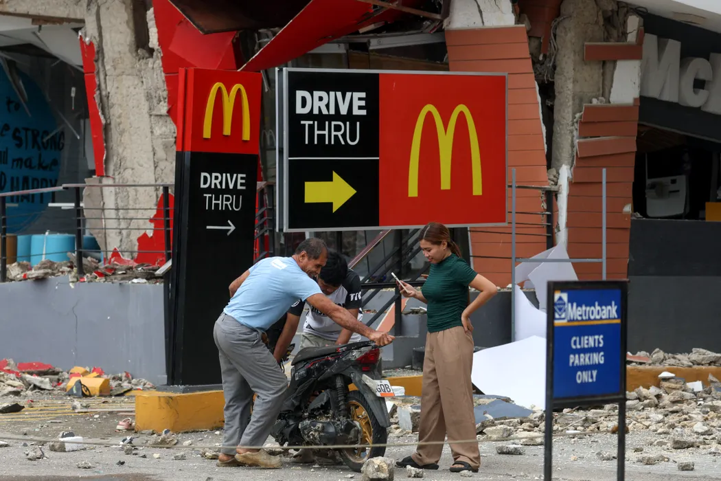 BOGO CITY, CEBU, PHILIPPINES - OCTOBER 1: People move a damaged motorcycle outside a partially collapsed fast-food restaurant, following a magnitude 6.9 earthquake that jolted parts of the island, in Bogo City, Cebu, Philippines on October 01, 2025. Widespread damages to structures and properties, and multiple injuries and deaths have been reported following a powerful magnitude 6.9 earthquake that struck parts of Cebu on September 30. Local governments have declared a state of calamity in response to the situation, amid continued aftershocks. Daniel Ceng / Anadolu/ABACAPRESS.COM